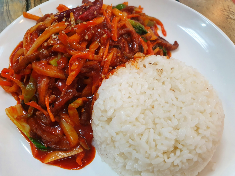 매운 맛과 고소한 맛, 달콤한 맛이 잘 어울러져 있는 덮밥이다.